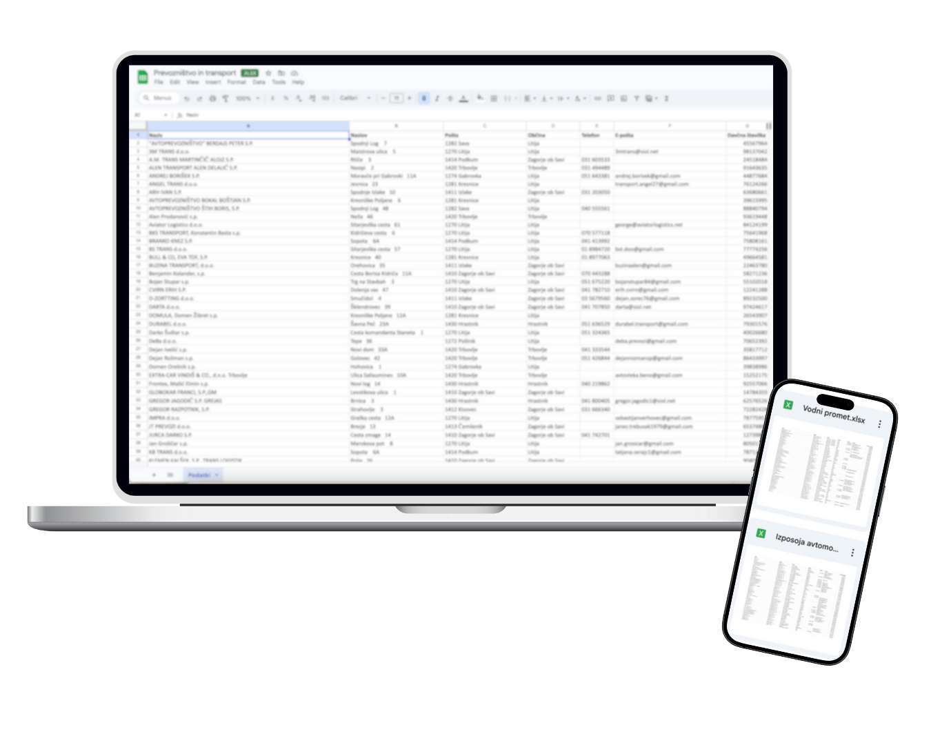 Bazo prejmete v ZIP datoteki, ki vsebuje Excel datoteke, kjer so kontakti že filtrirani po kategorijah. To vam omogoča enostavno iskanje, filtriranje in ciljno usmerjeno uporabo podatkov glede na vaše poslovne potrebe.